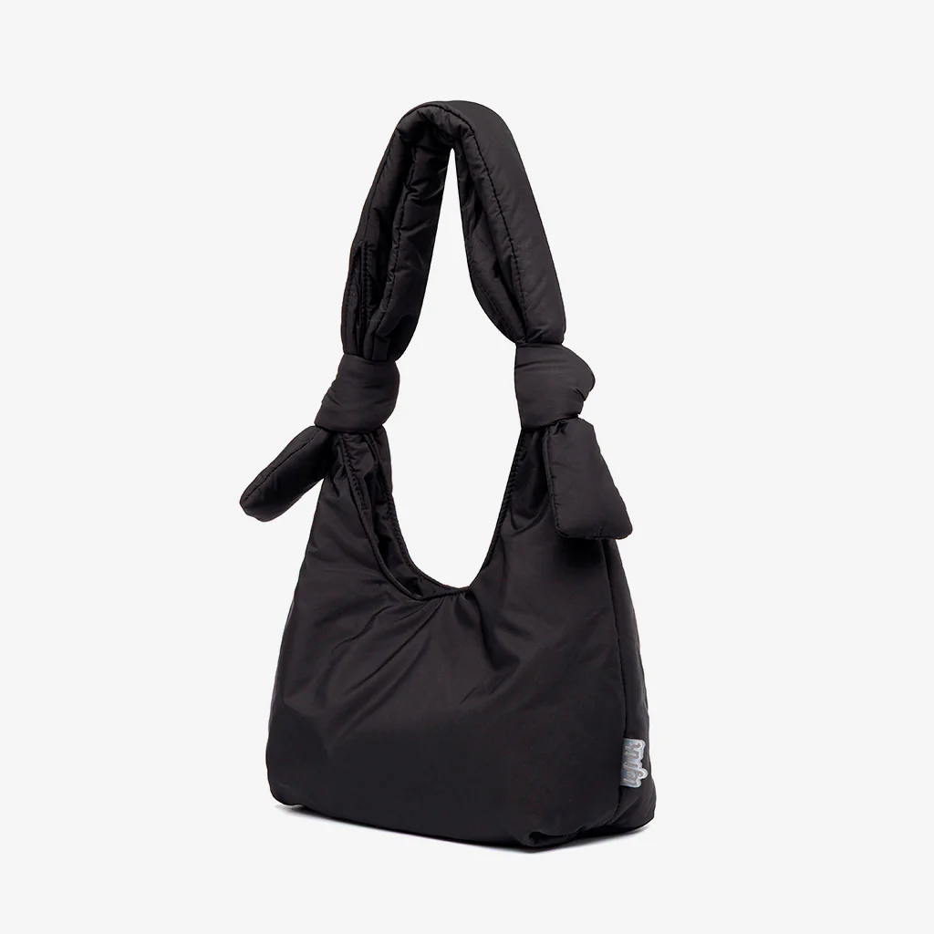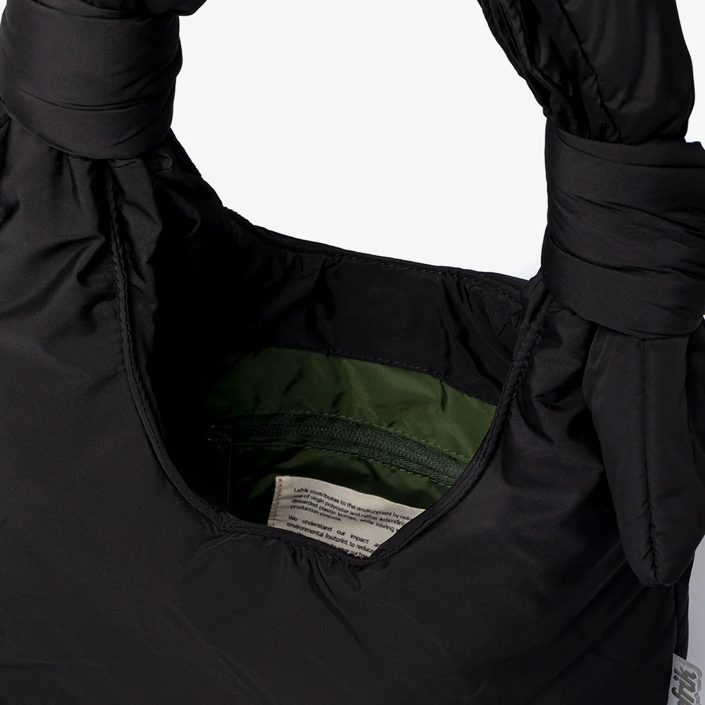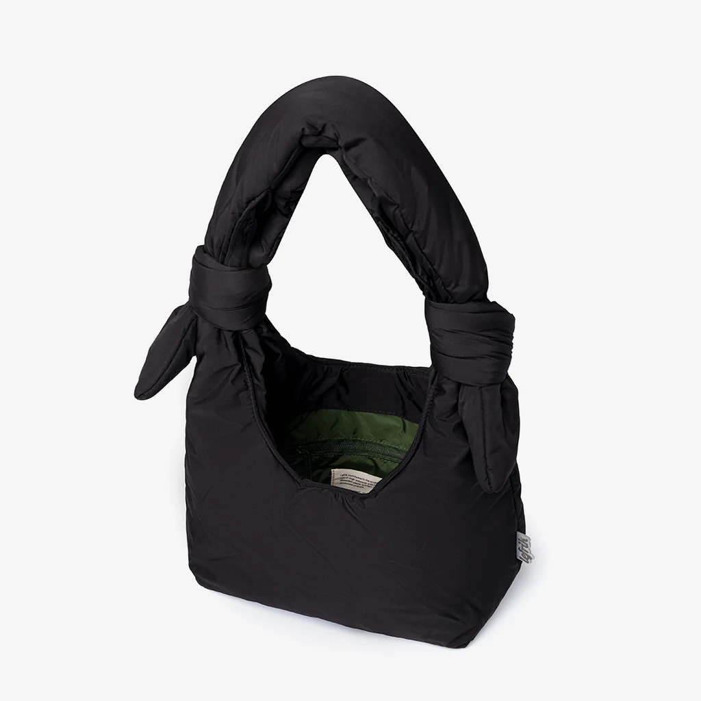 Versión Mini del bolso acolchado Biwa. Diseñado para ser utilizado tanto como bandolera como al hombro, gracias a sus lazos corredizos ajustables. Su tejido 100% reciclado y acolchado suave lo hacen muy ligero y agradable al tacto. Compartimento principal de gran capacidad y bolsillo interior con cremallera. Perfecto para el día o para la noche.