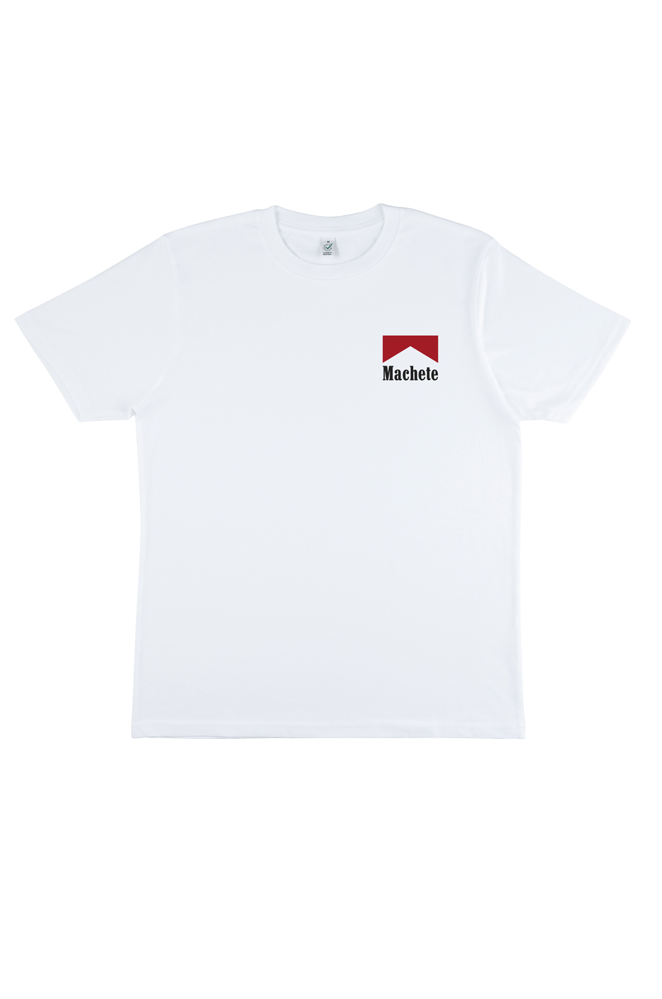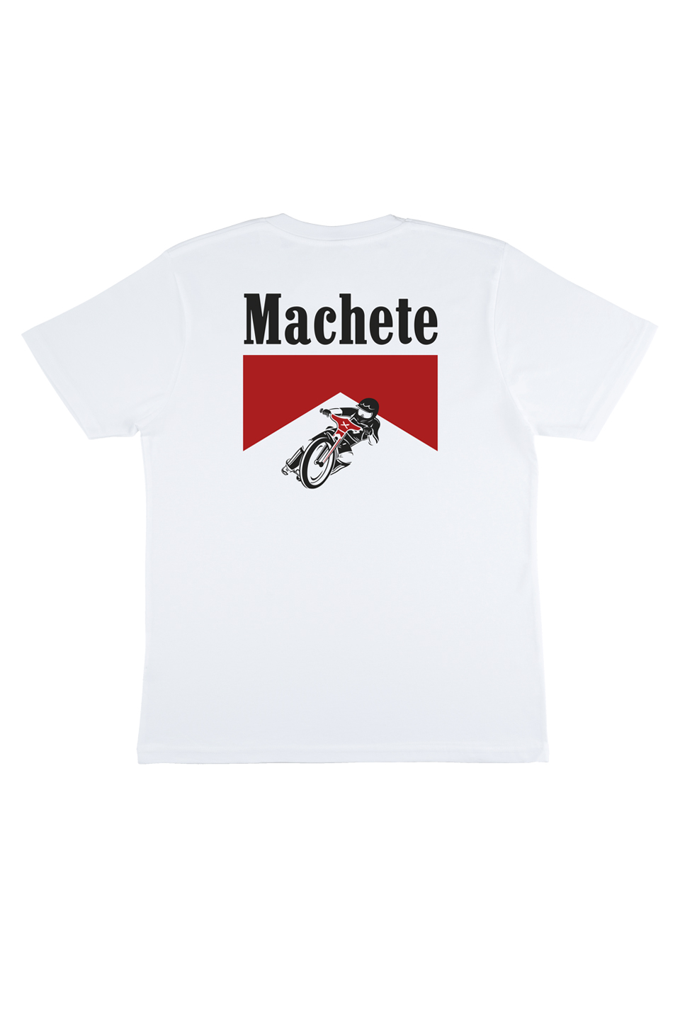 La camiseta speedway de manga corta de Machete Company cuenta con una composición de 100% algodón orgánico. Tiene un escote redondo de cuatro capas. Tiene cubre costuras reforzado en el cuello y en los hombros, además de costuras laterales. En la parte frontal la camiseta tiene estampado el logo de Machete Co. y serigrafía en la espalda.