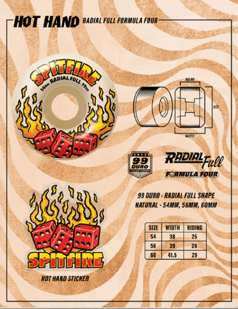 Marca SPITFIREDiámetro ruedas 56MMDureza ruedas 99AForma de rueda Radial Full